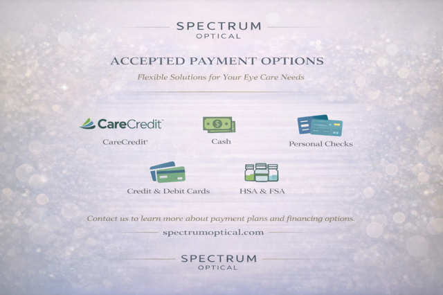 Spectrum Optical accepts CareCredit, a healthcare financing option that allows qualified patients to pay for treatments and eyewear with convenient monthly payments, often with promotional financing available.