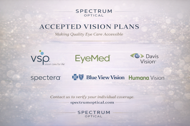 At Spectrum Optical, we believe exceptional eye care should be both accessible and convenient. We proudly partner with a wide range of vision and medical insurance providers to help maximize your benefits and minimize out-of-pocket costs.